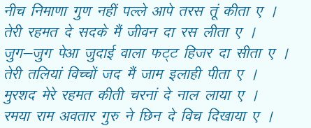 O' True Master, I was an ordinary person with no quality, you yourself have taken sympathy on me and with your divine grace, I have enjoyed my life. Ever since I tasted the cup of divine knowledge from you,the wound of separation (from God) that my heart had carried for ages, has been stitched; The True Master has been kind and gracious enough as he has accepted me at his holy feet. Baba Avtar Singh ji says, the True Master has revealed the all-pervading God, in a moment to me.